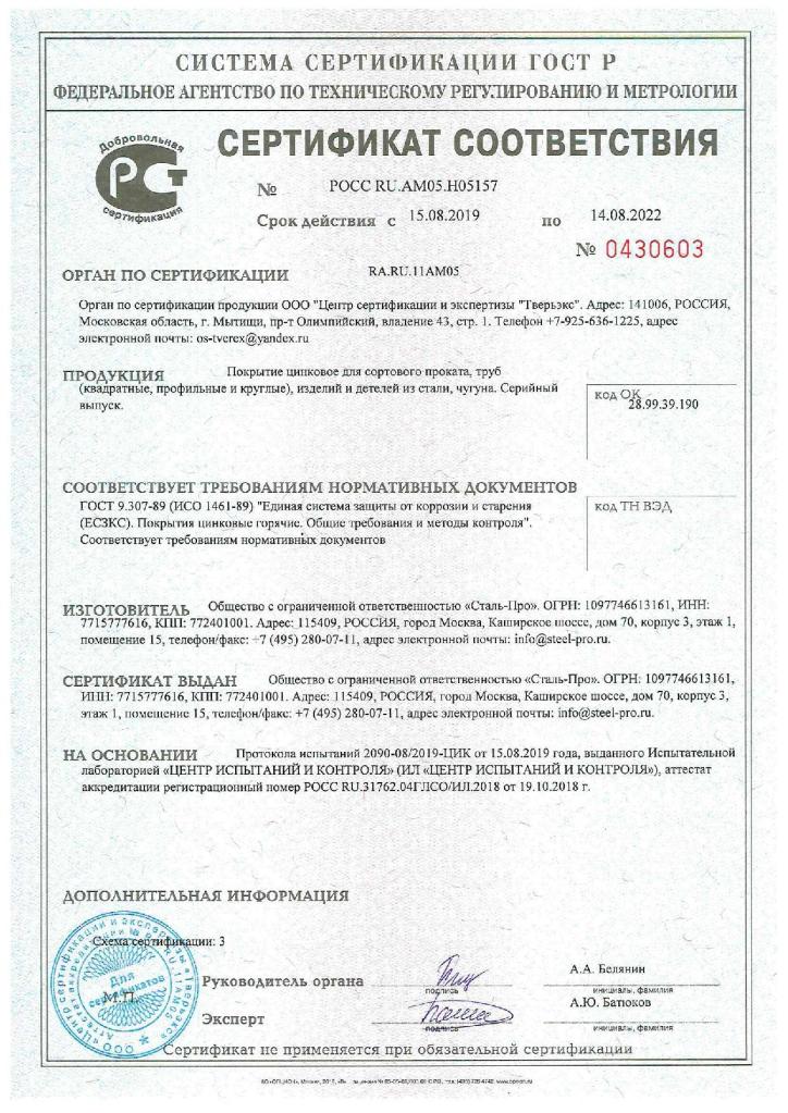 - Метод: Горячее цинкование по ГОСТ 9.307-89.